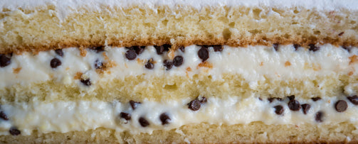 Layered Italian sponge cake soaked in rum and Strega with sweet ricotta filling sprinkled with dark chocolate morsels and frosted with whipped cream.