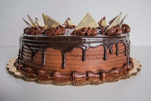 Layers of rich chocolate cake filled and frosted in chocolate buttercream, drizzled with chocolate ganache.